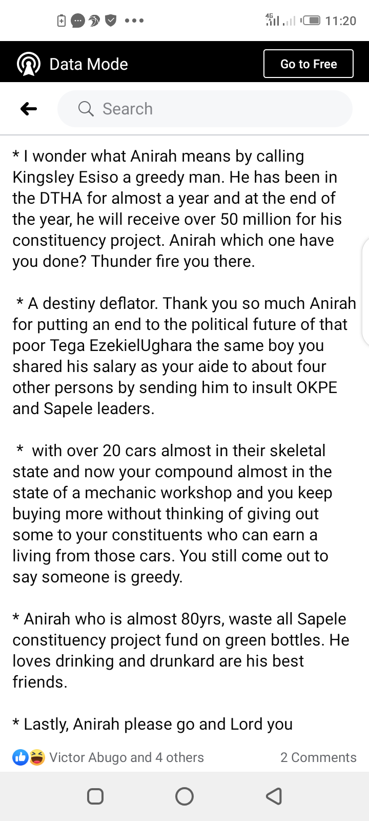 For the salaries of Legislative Assistants (LA) of Hi-Chief F.U. ANIRAH, it is also laughable for you to have said he is sharing my salary or the salary of any of us that are his statutory Four (4) Aides with others. You can make your findings from Mr. Tenison Boyo or any of the other Aides. The Honourable Member, representing Sapele State Constituency, DTHA can not stoop so low as to sharing the salary of Tega Ezekiel Ughara or any other of his Aide with four other persons.