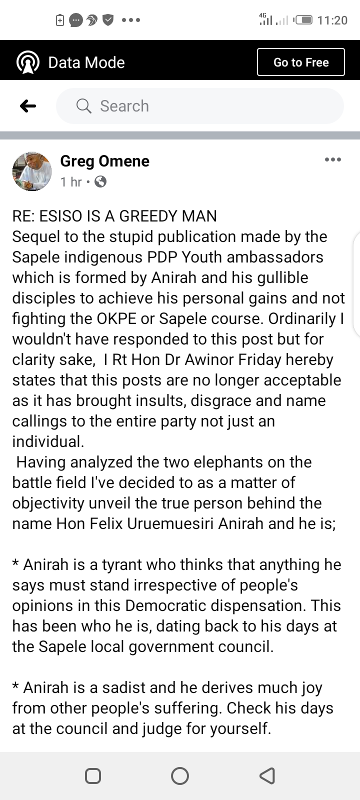 On the issue of putting an end to my political future, I am not surprised at you, Greg Omene the faceless writer, Awinor Friday and cohorts, because during the 2019 State Assembly primary elections you people also threatened that I have nailed my political coffin, for supporting Hi-Chief F.U. ANIRAH, but you were put to shame by God Almighty as my Principal emerged victorious. You people have started again with your normal threats by saying my Principal, Okakuro F.U. has put an end to my political future as if you are God or as if you know tomorrow. It might amaze you to know that I have not even started politics yet, because I am still learning from my Leaders (Okakuro F.U. ANIRAH, Hon. Godwin O. ATOSE and the other 14 great Leaders and Stakeholders who presented Hon. G.O. ATOSE as the choice candidate for the position of PDP State Chairman 2020)