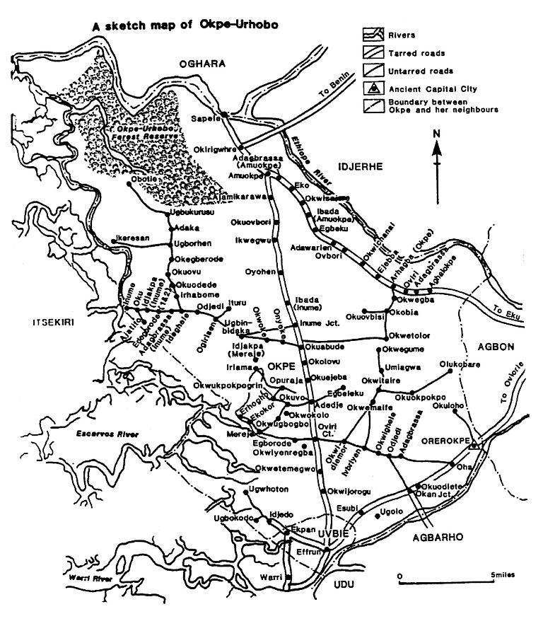 kingdom of Okpe, the largest monolithic Kingdom in Delta… Prince Igboze is the founding father of the royal family of the Okpe people. He was the son of an Oba (king) of Benin Empire. In the middle of the seventeenth century, he noticed the decline of the power of the Empire and, fearing for its future, determined to found his own kingdom. For this purpose he obtained his title of Ovie (king) from his second cousin, Oba Ahenzae of Benin, who was then on the throne, 1640 AD – 1661 AD. He left Benin Empire in the middle of the seventeenth century with his wives, family, and a number of followers (slaves) and set out southwards from Benin. It was an Israelite journey, he voyaged through modern day Auchi, Akoko-Edo, there are Okpes in Akoko-Edo till date (they were known to be the food basket of Edo then), he further located Patani through the river Niger and finally arrived at his new territory of Orere-Olomu. After a decade or so, when Igboze’s new kingdom was well established, he was later visited by an Igbo named Olomu. Olomu lived with Igboze for a long time and succeeded in winning the confidence of Igboze to such an extent that Igboze declared him his heir. Igboze, who had obtained the royal title of Ovie (king) to rule his new territory, was at the height of his power when he died. Upon Igboze’s death, Olomu took the title of Ovie. This caused a rift, because Igboze’s son, Okpe, quarreled with Olomu about who should succeed as king (Bradbury, 1957, p. 131; Hubbard, 1948, pp. 237-8; Asagba, 2005, p. 7). Okpe and his followers later left the territory and settled in the Agbarho quarters of the Isoko Okpe. Okpe lived and died in Isoko Okpe. Before his death, Okpe had four sons: Orhue, Orhoro, Evwreke, and Esezi. The descendants of those four sons are the royal members of the Urhobo Kingdom of Okpe (Otite, 1973 and Asagba, 2005). Since 1770 – 1779 AD till date the Kings are called Orodje. It is one of the many kingdoms that make up Urhobo tribe. Its capital is Orerokpe.